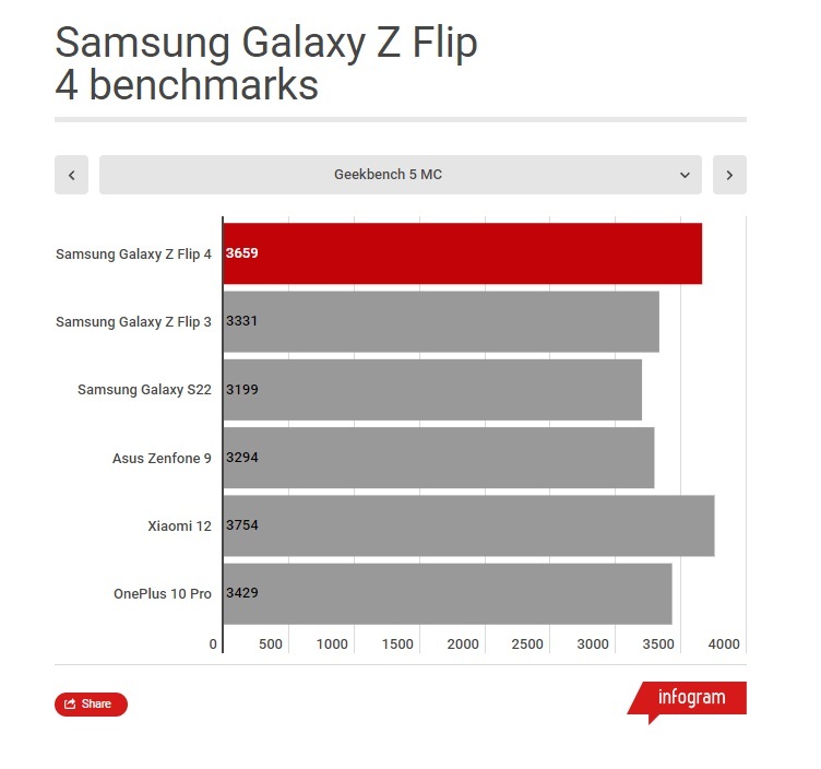 삼성은 Z 플립4에 최신 프로세서인 스냅드래곤 8+ Gen 1을 탑재했다. 스냅드래곤 888을 사용한 Z 플립 3보다 성능이 업그레이드된 셈이다. 다만 RAM이 8GB로 제한되어 조금 실망스럽고, 폼 팩터 때문에 냉각 성능이 제한됐다. 따라서 Z 플립4로 까다로운 작업을 하려고 하면 조금 뜨거워질 수 있다. 8+ Gen 1 탑재한 타사 스마트폰과 비교해 가장 빠른 성능을 보이는 것도 아니다. 다만 대부분 엄청난 성능을 Z 플립4에서 기대하지 않는 점을 고려했을 때, 일반적인 사용 범위 안에서 Z 플립4는 결함이 거의 없으며, 까다로운 게이머 정도만 성능에 불만을 가질 것이다.