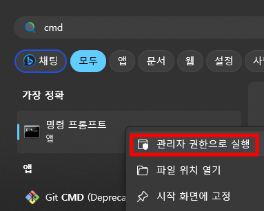 1. cmd를 관리자 권한으로 실행 시켜줍니다.